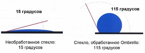 Благодаря нанопокрытию Ombrello, вода не смачивает стекло и имеет минимальную площадь контакта с поверхностью стекла, из-за чего не задерживается и быстро стекает под собственным весом или сгоняется потоком воздуха во время движения автомобиля.