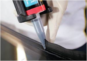 8. Нанесите слой клея треугольного сечения, используя поставляемую насадку специальной формы, на кромку стекла или посадочное место стекла. Внимание! Наносите клеевой слой по глубине посадочного места, согласно спецификации производителя автомобиля. При необходимости, обрежьте насадку с помощью щипцов Sika® NozzleCut.