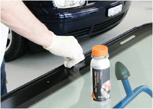 5. Подготовка ветрового стекла. Очистите ветровое стекло, используя Sika® CleanGlass (стекло должно быть чистое и сухое). Для подготовки поверхности к склейке нанесите раствор Sika® Aktivator с помощью чистой, не содержащей волокна, тканью движением по поверхности в одном направлении. Не наносите активатор на одну и ту же поверхность дважды. Время сушки: 10 минут (при t от +10°С до +35°С). При вклейке стекол с полиуретановым слоем, применяя не содержащую волокна ткань, равномерно наносите средство Sika® Aktivator движением по поверхности в одном направлении. Время сушки: 10 минут (при t от +10°С до +35°С).