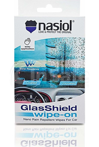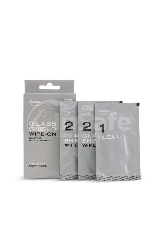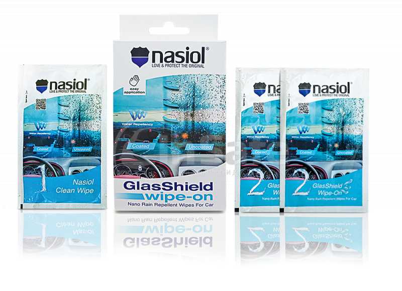 Nasiol GlasShield WIPE ON нано водоотталкивающее покрытие для автостекл и зеркальных поверхностей в виде пропитанных защитным составом салфеток.