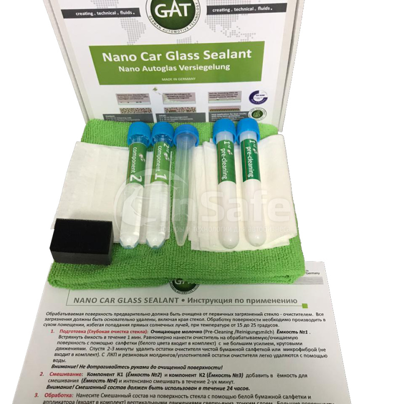 Нанопокрытие для автостекол. Профессиональное нанопокрытие для стекол, обеспечивающее лучшую видимость и, соответственно, повышенную безопасность дорожного движения. Стекла на длительное время приобретают влагоотталкивающие свойства, легче очищаются и легче размораживаются. Под воздействием встречного потока воздуха при движении автомобиля, стекла автомобиля самоочищаются. Не содержит силикона, воска и т.п. Длительность действия - 12 месяцев или 20000 км пробега.