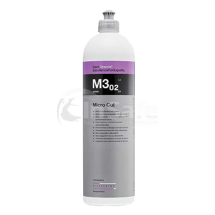 Политура для зеркального блеска с устранением эффекта „голограммы“ Micro Cut M3.02 – машинный микро-полирующий состав последнего поколения, предназначенный для долговременного устранения полировальной „вуали“, „голограмм“, мелких царапин и аншлифов до размера зернистости 3.000 на всех лакокрасочных системах (включая системы, устойчивые к возникновению