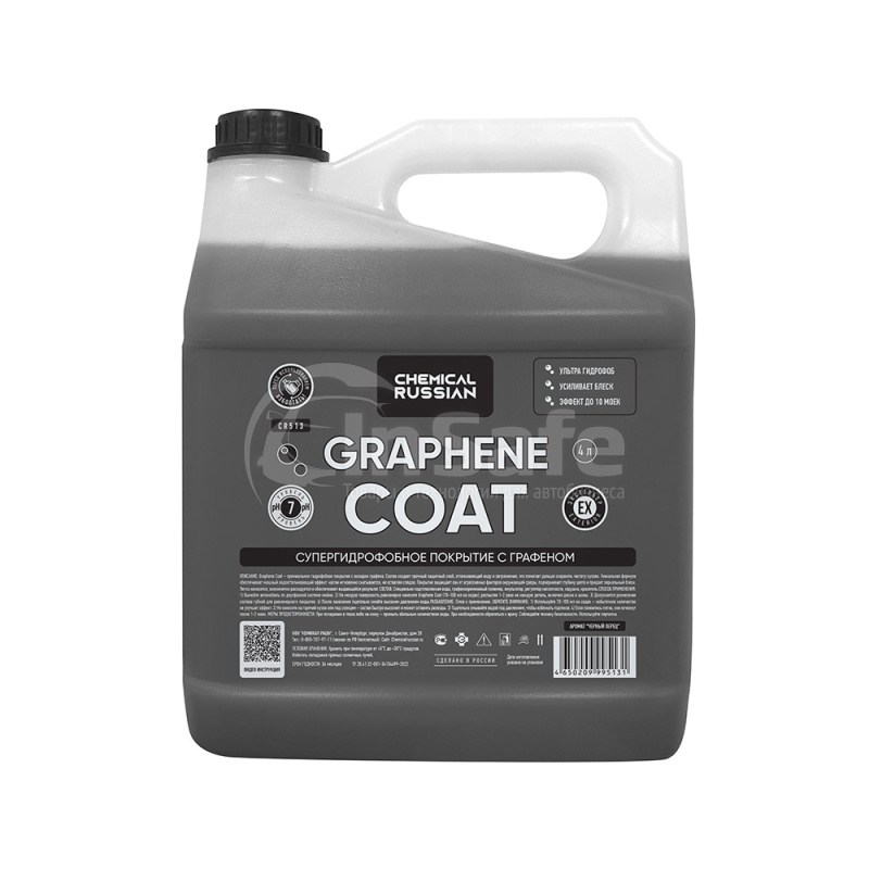 Производитель оставляет за собой право на изменение внешнего вида, комплектации и технических характеристик товара Graphene Coat - покрытие для мощного гидрофоба и блеска с графеном, 4 л, CR513, Chemical Russian без уведомления дилеров. Указанная информация не является публичной офертой.
