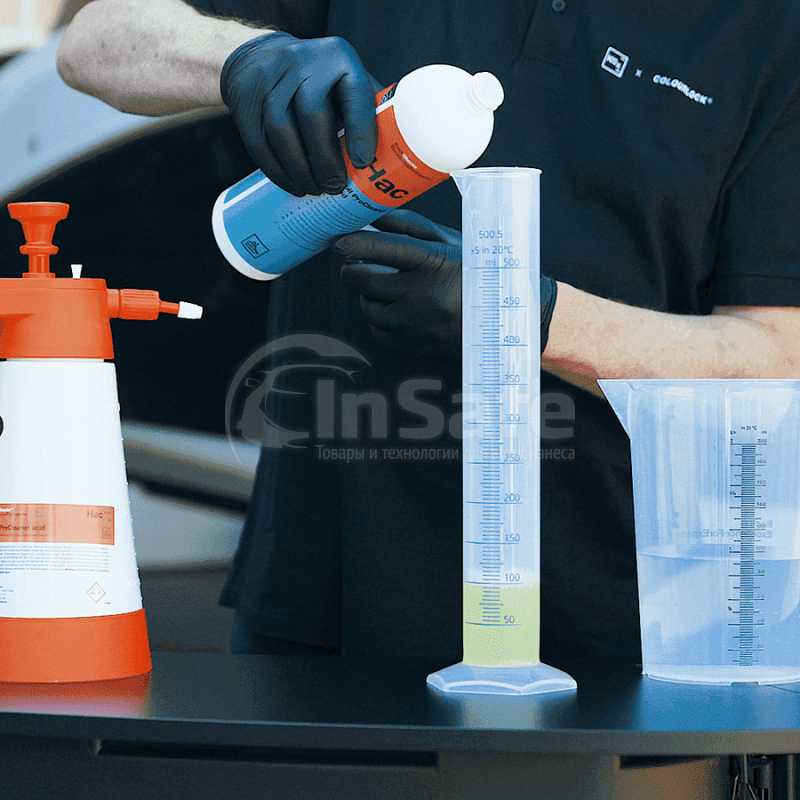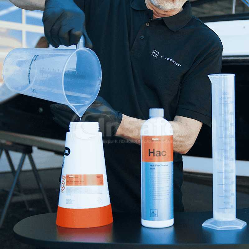 В зависимости от степени загрязнения развести средство для предварительной очистки с водой в соотношении 1:10, при сильных загрязнениях наносить в чистом виде; нанести на поверхность с помощью распылителя Pressure Sprayer acid или моющей губки и подождать не более 5 минут. При необходимости обработать губкой Interior Scrubber. Затем тщательно промыть водой, используя мягкую губку. После тщательной очистки отполировать поверхность и нанести на нее слой защитного средства, чтобы предотвратить повторное загрязнение. При очистке не допускать попадания средства на легкоповреждаемые поверхности, такие как оцинкованная сталь или алюминий.