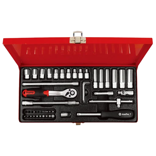Профессиональный набор головок, бит и аксессуаров 1/4" T45012 AmPro Tools состоит из 48 предметов, находящихся в металлическом кейсе.