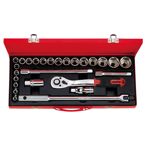 Универсальный набор головок и аксессуаров 1/2" T45412 AmPro Tools состоит из 26 предметов, находящихся в металлическом кейсе.