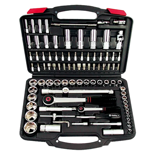 Профессиональный набор головок и аксессуаров 1/2 и 1/4" с 94 предметами в пластиковом кейсе T45486 AmPro, содержит всё необходимое для сервисного обслуживания и является незаменимым слесарным инструментом.