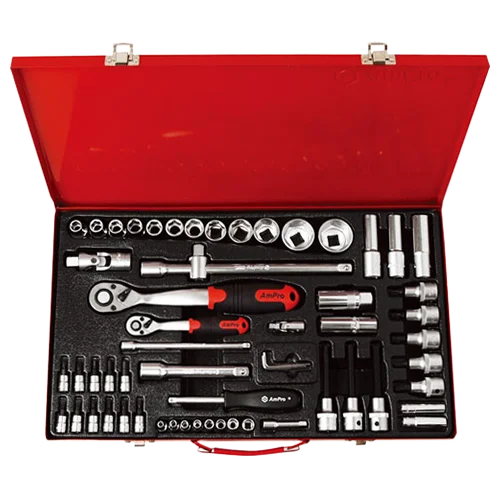 Профессиональный набор головок и аксессуаров 1/2" и 1/4" T45417 AmPro Tools состоит из 60 предметов, находящихся в металлическом кейсе.
