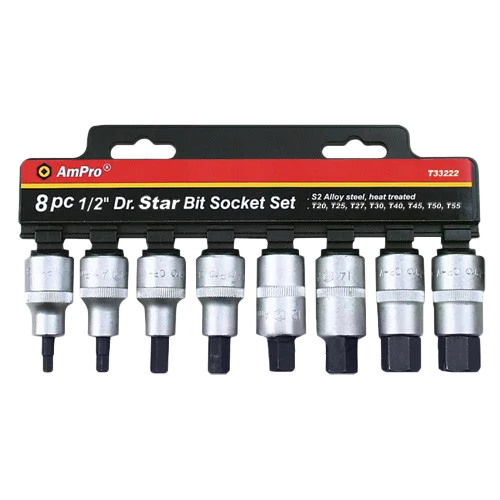 Базовый набор головок со вставкой TORX 1/2" T33222 AmPro Tools состоит из 8 предметов, расположенных на планке.