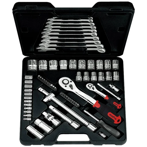 Профессиональный набор инструмента 1/2" и 1/4" T45462 AmPro Tools состоит из 70 предметов, находящихся в пластиковом кейсе.