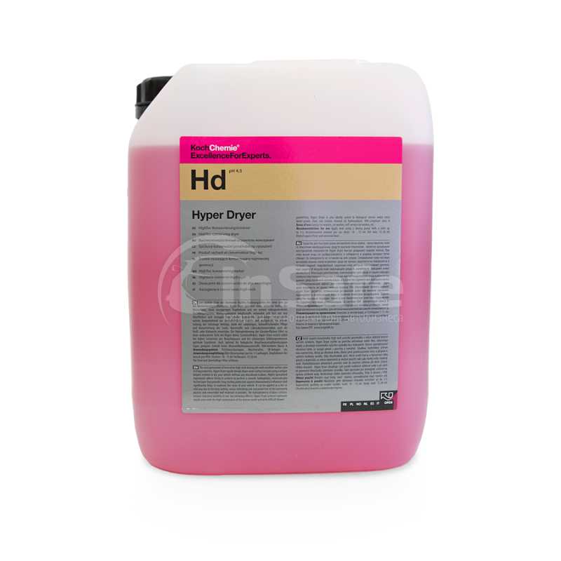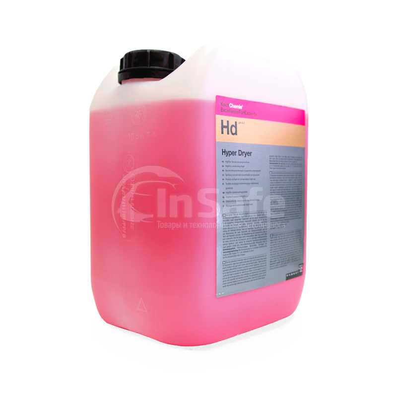 Средство для быстрой сушки автомобиля после мойки - представитель нового поколения инновационных средств высокой технологии - является идеальным консервантом поверхности. Hyper Dryer быстро разрушает водную пленку. При этом капли воды не разбрызгиваются, а собираются в шарики, которые легко стекают по поверхности не оставляя на ней следов. Специальные нано-частицы на основе ионной связи позволяют средству прочно закрепится на поверхности и создают гладкий, гидрофобный, защитный слой, который обеспечивает длительную защиту от воздействий окружающей среды и значительно замедляет износ автомобиля. Благодаря длительному, освежающему цвет уходу и защите лакокрасочных и пластиковых покрытии, а так же мягких покрытий для крыш кабриолетов, данное средство можно использовать и в качестве горячего или холодного воска. Водоотталкивающий эффект для стеклянных поверхностей - антидождь - улучшает видимость во время сильных осадков (без образования эффекта дымки). Hyper Dryer достигает оптимальных результатов даже при высоких значениях проводимости используемой воды и сложной геометрии воздуходувки. Данное средство идеально подходит также и для биологических очистных сооружений. Не содержит нефтяных углеводородов. По системе VDA соответствует классу А.