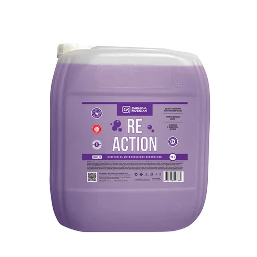 - ReAction — это высокоэффективный профессиональный бескислотный очиститель металлических вкраплений, созданный для колесных дисков и лакокрасочного покрытия (ЛКП). Его сбалансированная рН-нейтральная формула безопасно и эффективно удаляет металлические вкрапления не только с легкосплавных дисков и ЛКП, но также с хрома, стекла и пластика. ReAction идеально подходит для глубокой очистки автомобиля перед полировкой. При взаимодействии с загрязнениями состав окрашивается в фиолетовый цвет, что служит индикатором его работы. Безопасен для всех типов дисков.