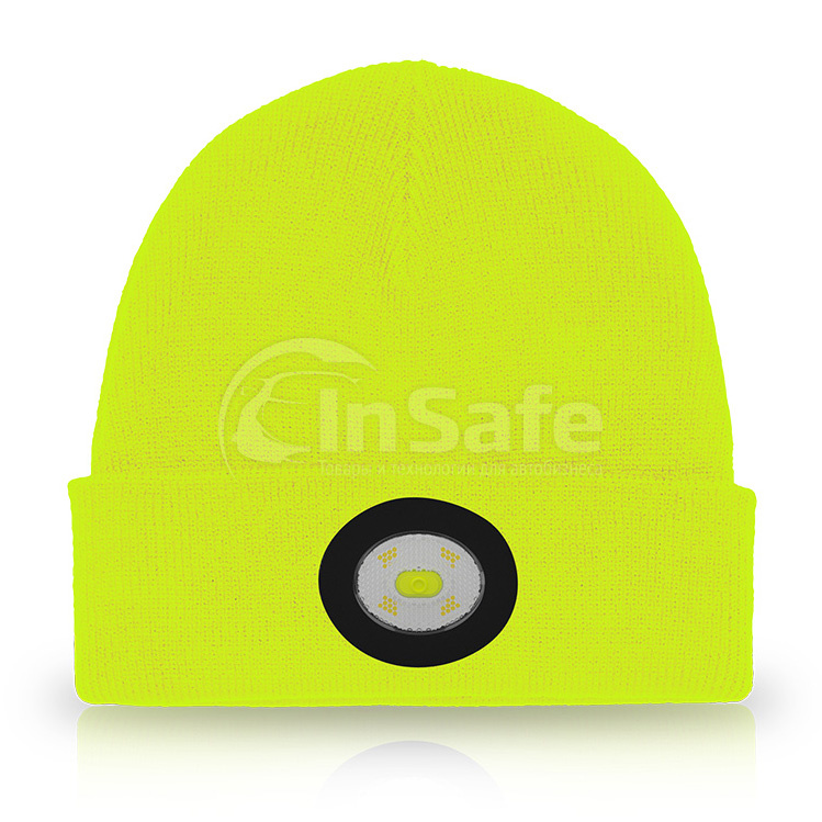 Шапка желтая со съемным встраиваемым светодиодным фонариком 150 лм Samsung® SMD LEDs и 3-мя режимами работы. Зарядка от USB. Аккумулятор 420 mAh Li-po обеспечивает время работы от 2,5 до 6,5 часов. Поставляется со шнурком для использования в качестве брелка. Материал: 35% акрил, 65% полиэстер, машинная стирка при 30?C.