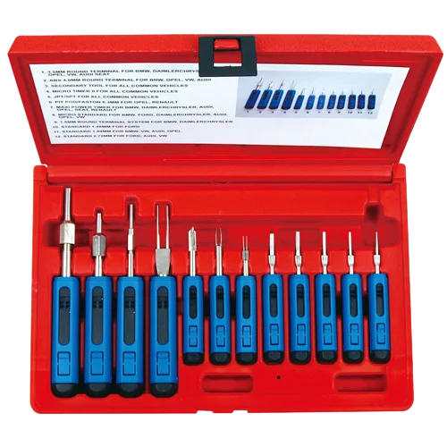 Универсальный набор для съема контактов T71069 AmPro Tools состоит из 12 предметов, находящихся в пластиковом кейсе.