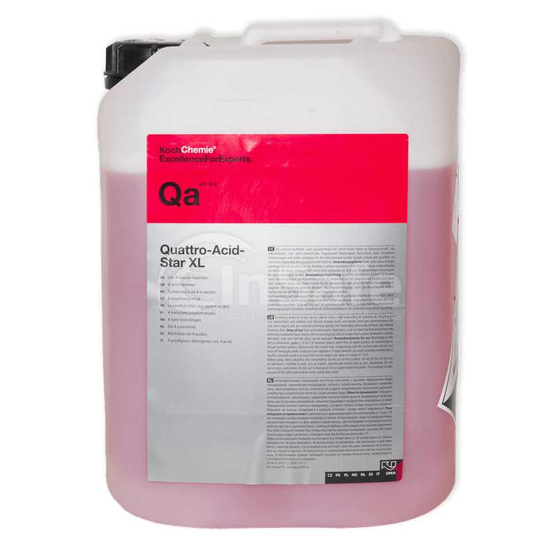 Когда другие кислотные чистящие средства достигают своих предельных возможностей — QUATTRO-ACID STAR XL начинает свое действие. Этот очиститель включает в себя сильнейшие кислоты и очищает от всех возможных загрязнений, оставляя после смывания чистую, блестящую поверхность. Данный состав в разбавленном состоянии не влияет на ЛКП и может применяться для удаления бетона, извести, побелок с потолка гаражей. Высококонцентрированное средство имеет невероятную силу действия и применяется на кислотостойких не поврежденных поверхностях.